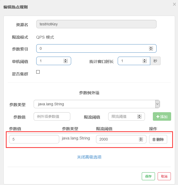 资源名:唯一名称,默认请求路径。针对来源:Sentinel 可以针对调用者进行限流,填写微服务名,默认 default(不区分来源)。阈值类型/单机阈值:QPS(每秒请求数量):当调用该 API 的 QPS 达到阈值的时候,进行限流。