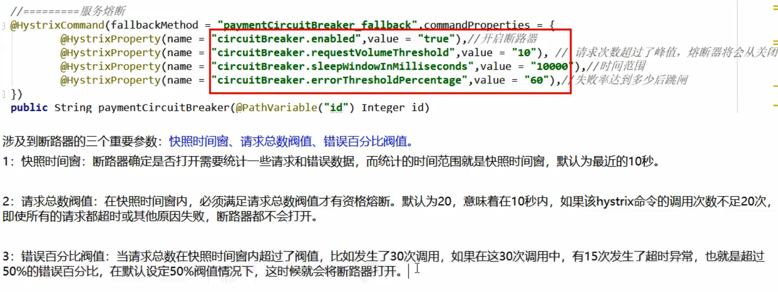 包裹请求:使用 HystrixCommand 包裹对依赖的调用逻辑,每个命令在独立线程中执行。使用了设计模式中的命令模式。跳闸机制:当某服务的错误率超过一定的阈值时,Hystrix 可以自动或者手动跳闸,停止请求该服务一段时间。资源隔离:Hystrix 为每个依赖度维护了一个小型的线程池(或者信号量)。如果该线程池已满,发往该依赖的请求就被立即拒绝,而不是排队等待,从而加速失败判定。监控:Hystrix 可以近乎实时的监控运行指标和配置的变化,例如成功、失败、超时、被拒绝的请求等等。回退机制:当请求失败、超时、被拒绝、或当断路器打开时,执行回退逻辑。回退逻辑由开发人员自行提供,例如返回一个缺省值。自我修复:断路器打开一段时间后,会自动进入“半开”状态。