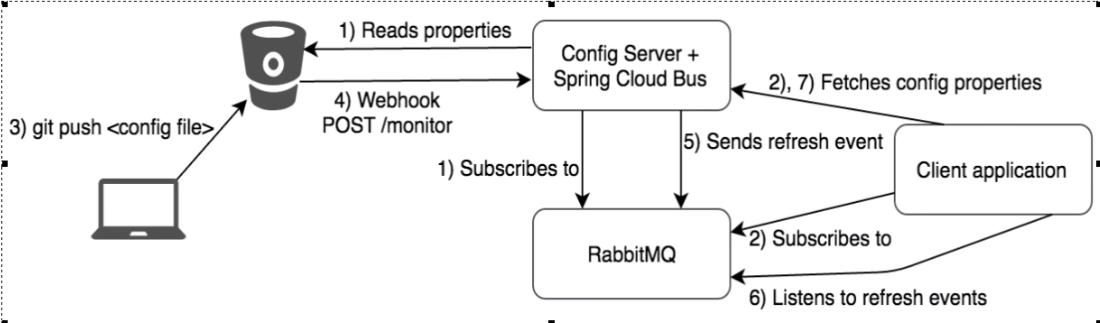 根据上图我们可以看出 Spring Cloud Bus 做配置更新的步骤: